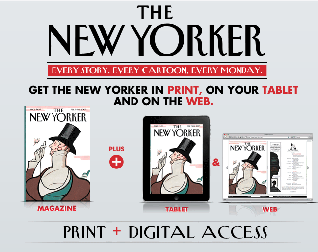 Tạp chí The New Yorker cung cấp gói đăng ký trực tuyến để truy cập toàn bộ nội dung kỹ thuật số, bao gồm các bài viết, ứng dụng và kho lưu trữ. Người đăng ký có thể đọc không giới hạn trên trang https://www.newyorker.com/ và qua các ứng dụng di động chính thức trên Android và iOS cùng tên của The New Yorker.